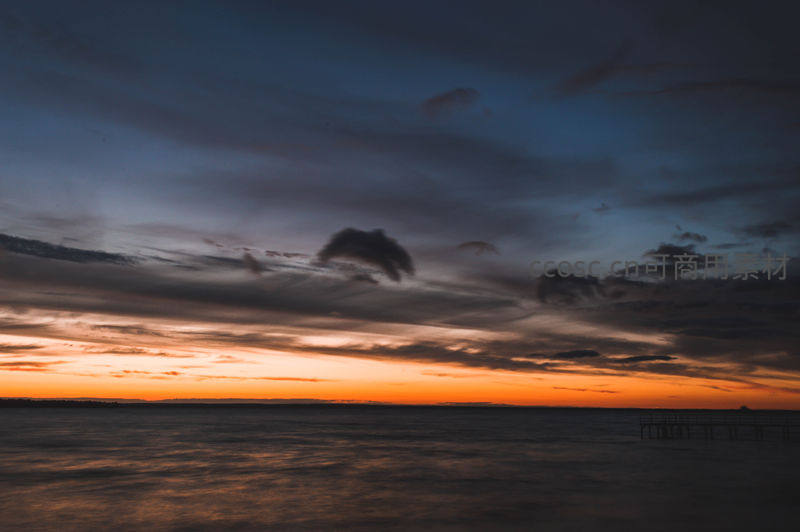 深蓝天空与橙红晚霞交织,云层如墨,海面平静,远处码头剪影勾勒出一幅宁静而壮阔的黄昏画卷。