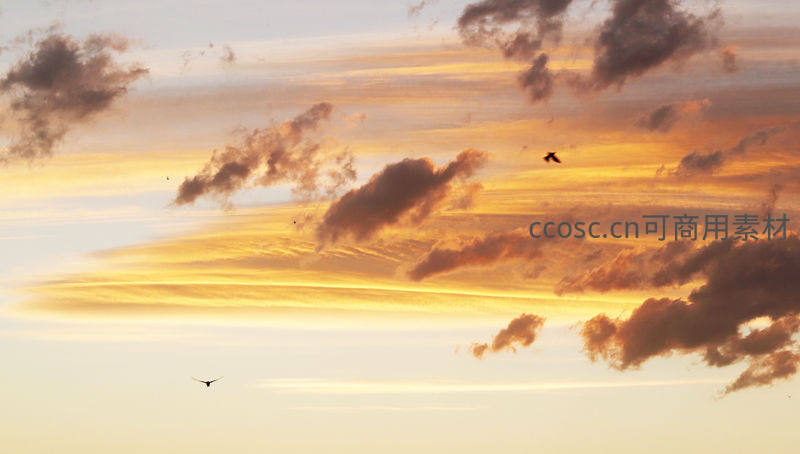 绚烂的金色云层铺满天空,几只飞鸟的剪影划过天际,为这幅壮丽的日落图景增添了动感与生机。