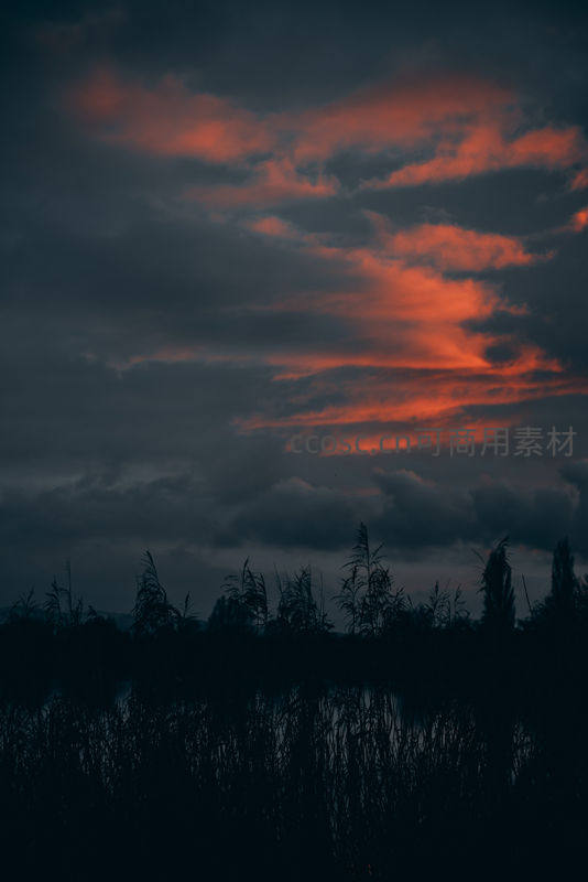 深蓝的天空被夕阳染成橙红色,湖面倒映着天光,岸边芦苇的剪影勾勒出静谧的黄昏画卷。