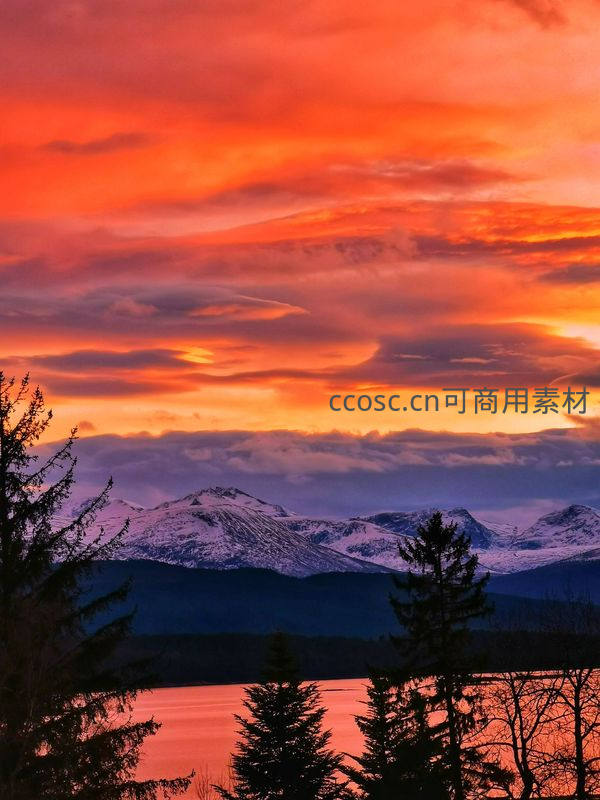 雪峰巍峨耸立,湖水如镜,将头顶那片燃烧般的火红天空完整倒映,构成一幅壮丽的自然奇景。