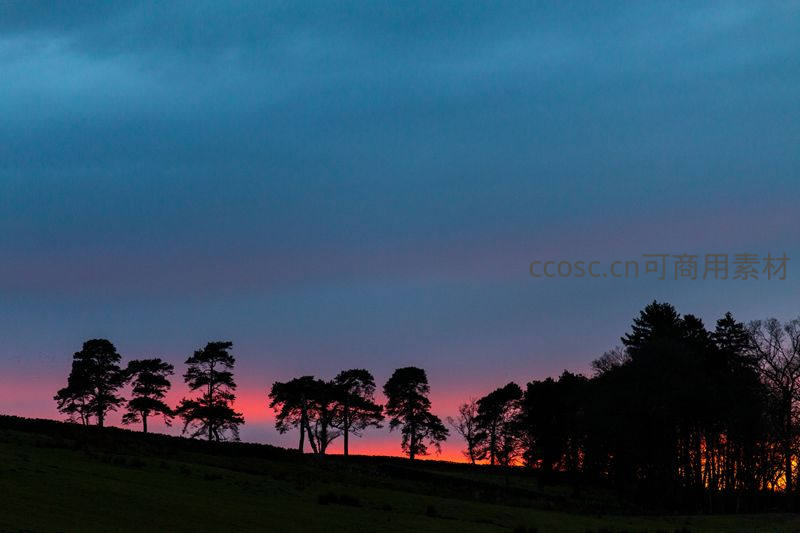 连绵的绿色山丘上,树木的黑色剪影与渐变的蓝粉暮色天空形成鲜明对比,充满梦幻与宁静之感。