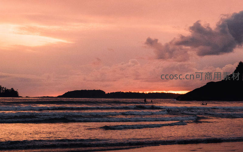 金色的夕阳沉入海平面,波涛轻拍沙滩,远处岛屿和人物的剪影点缀其间,构成一幅动态的海滨暮色图。