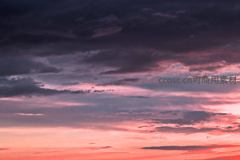 厚重的云层被落日余晖染成梦幻的紫红色调,层层叠叠铺满天空,展现出大自然在黄昏时分最温柔而壮丽的色彩变幻。