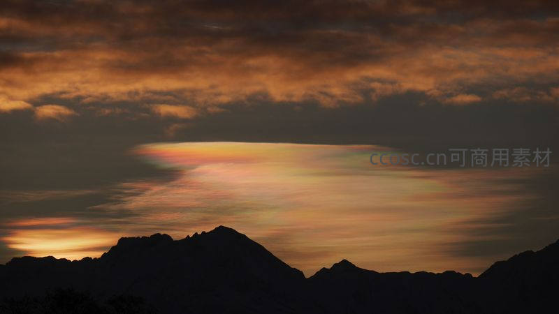 连绵的山峦剪影之下,天空中悬浮着一片罕见的虹彩云,它散发着柔和的七彩光芒,如同天空的宝石,静谧而神秘。