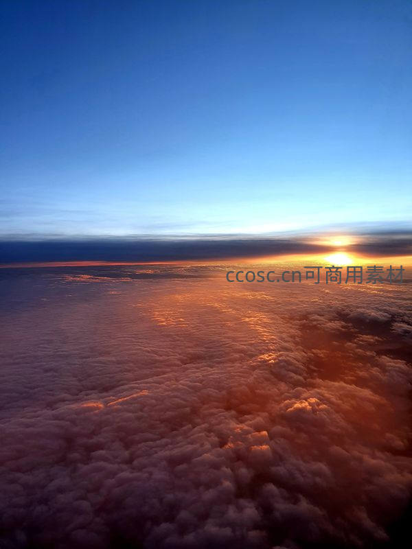 从万米高空俯瞰,太阳正从云海边缘冉冉升起,金色光芒洒满无垠云层,下方是翻腾的白色云海,景象恢弘绝美。