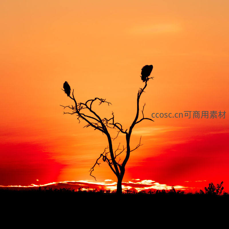 一棵枯树的剪影矗立在火红的夕阳前,两只鸟儿栖息其上,构成一幅充满诗意与孤独感的自然画卷。