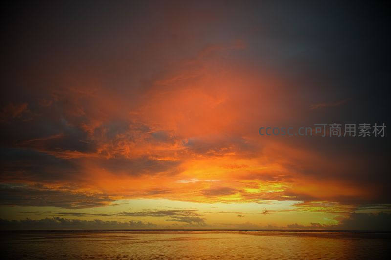 天空被浓烈的火烧云所占据,橙红色的光芒洒满海面,水天相接处一片金黄,展现出大自然最壮丽的黄昏时刻。