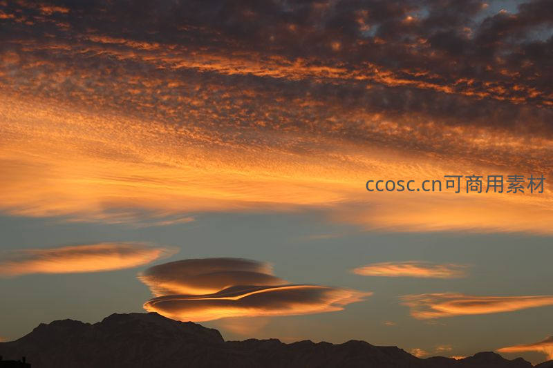 独特的荚状云在夕阳下泛着金光,形如巨大的飞翼悬浮于山峦之巅,与下方的暗色山体形成强烈对比,景象奇幻而壮观。