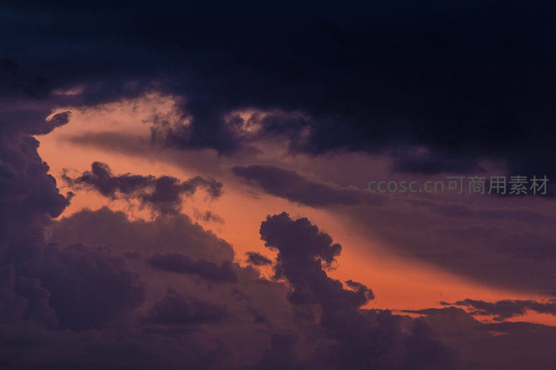 深紫色的云层与橙红色的霞光交织,形成强烈的色彩对比,仿佛天空正在上演一场恢弘的自然戏剧。