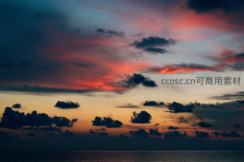 绚丽的红粉色晚霞铺满天空,与平静的海面相接,构成一幅色彩饱和、充满诗意的海滨日落全景图。