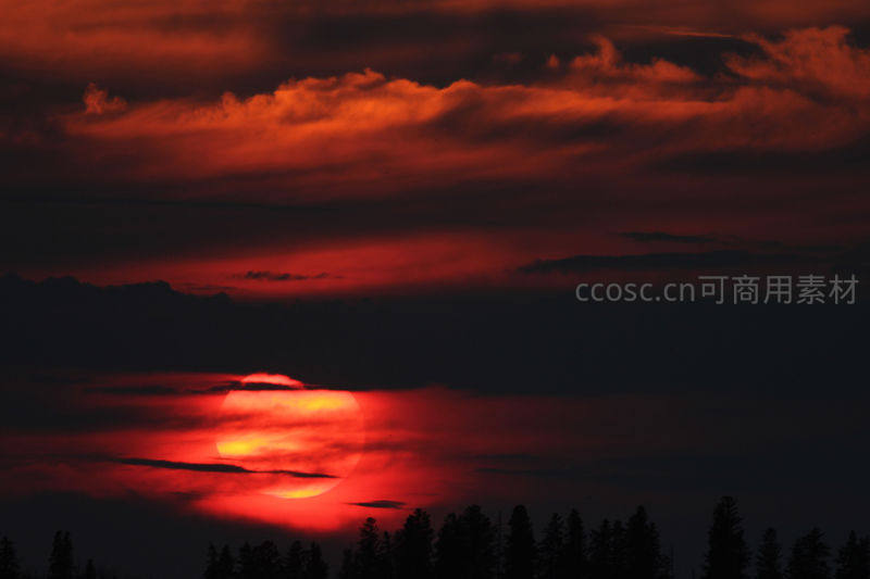 巨大的红日被厚重云层半遮,下方是深邃的森林剪影,整个画面充满神秘与史诗感,仿佛世界尽头的黄昏。