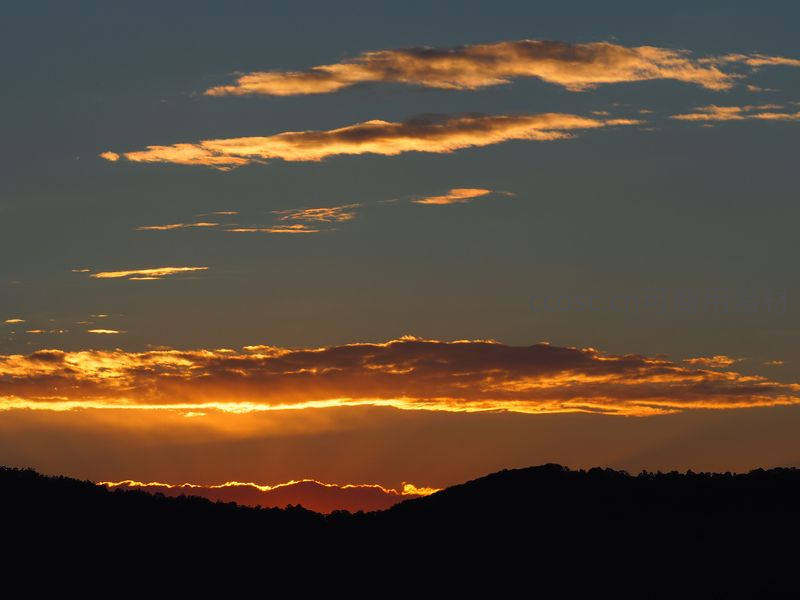 夕阳余晖洒满天际,金色的云层如河流般在山峦之上缓缓流淌,山体的黑色剪影勾勒出大地轮廓,辉煌而宁静。