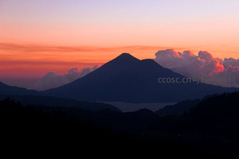 两座巍峨山峰在夕阳下形成清晰剪影,身后云海翻腾,被霞光染成绚烂的橙红色,展现出大自然无与伦比的壮丽与宁静。