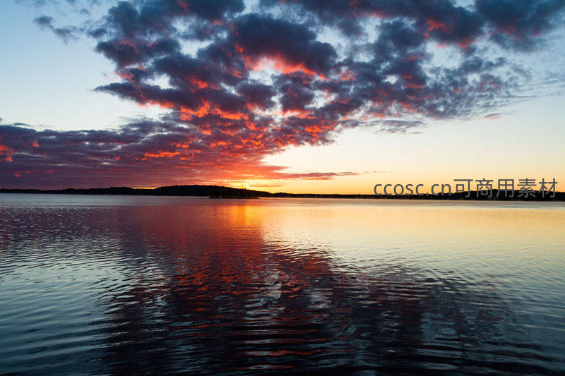 广阔的湖面波光粼粼,完美倒映着天空中燃烧般的晚霞与翻滚的云朵,水天一色,营造出令人陶醉的宁静与壮美之境。