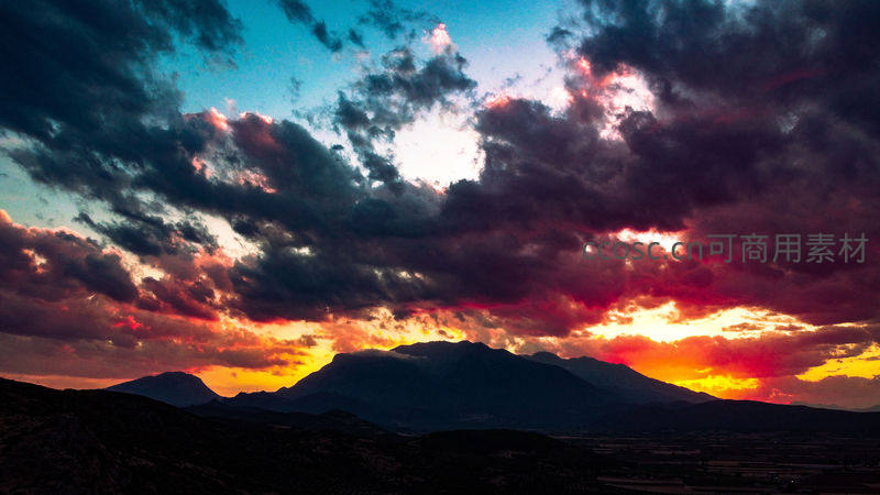 连绵的山峦在夕阳下化为深邃剪影,头顶的云海被落日余晖点燃,呈现出从金黄到深紫的瑰丽渐变,宛如一场盛大的自然戏剧正在上演。