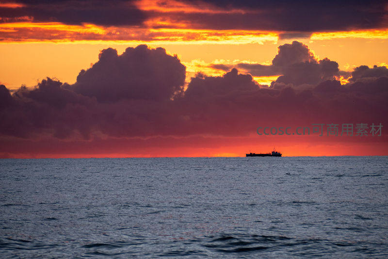 一艘货轮的黑色剪影孤独地航行在无垠的海面上,身后是被夕阳染成血红与金黄的巨大云团,广阔的海天之间弥漫着一种壮阔而孤寂的诗意。