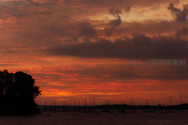 夕阳西下,天空被染成绚烂的橙红色,港口内停泊着众多帆船,它们的剪影与天际线融为一体,宁静而壮美。