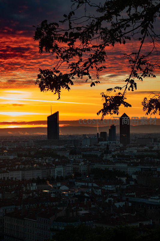 从高处俯瞰城市,前景的树枝如画框般框住远方的双塔建筑,绚丽的晚霞铺满天空,为整座城市披上温暖的金色外衣。