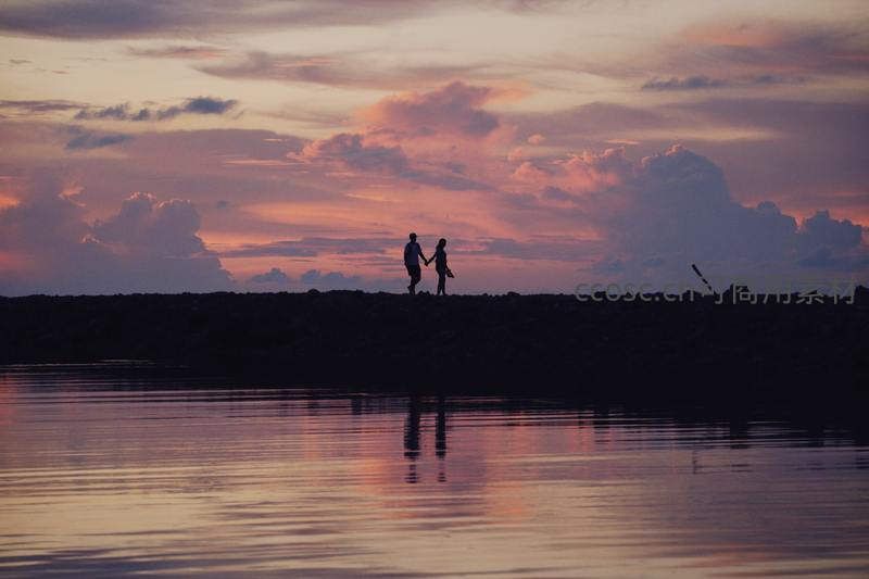 情侣剪影漫步水岸,共赏绚烂黄昏