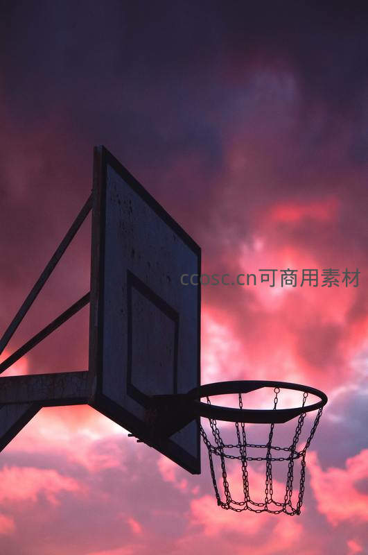 一个孤寂的篮球架剪影矗立在燃烧般的晚霞之下,铁链篮网在风中轻晃,仿佛承载着无数关于青春、汗水与未竟梦想的无声故事。
