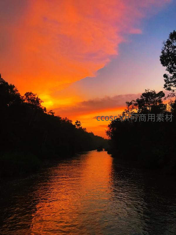 蜿蜒的河流被两岸茂密的森林环抱,水面倒映着燃烧般的晚霞,营造出静谧而壮丽的自然风光。