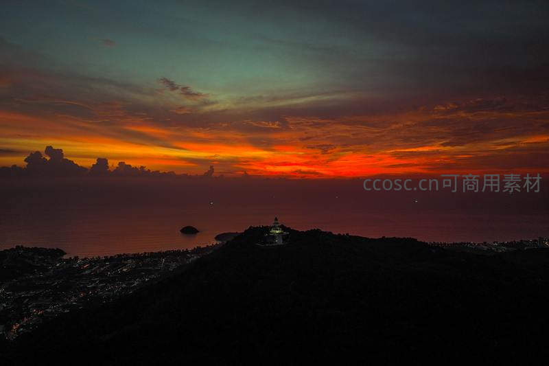 从高处俯瞰,一座灯塔矗立于山巅,脚下是沉入暮色的城市与海湾,天空被晚霞染成绚丽的色彩。
