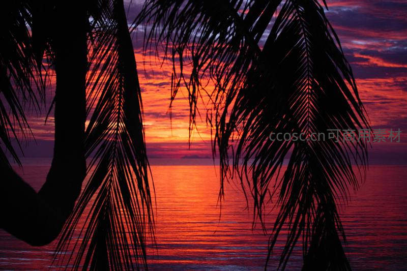 前景中棕榈叶的黑色剪影勾勒出热带风情,背景是海天相接处绚烂的红紫晚霞,浪漫而宁静。