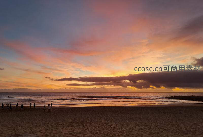 金色的沙滩上,人们悠闲地散步,头顶是色彩斑斓、层次丰富的晚霞,构成一幅温馨惬意的黄昏图景。