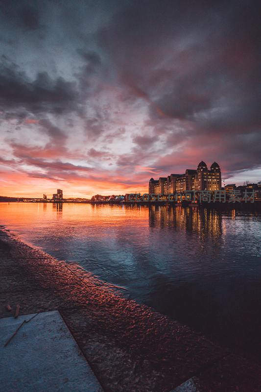 绚丽晚霞铺满天际,城市建筑与灯光倒映在平静湖面,构成一幅现代与自然交融的宁静画卷。