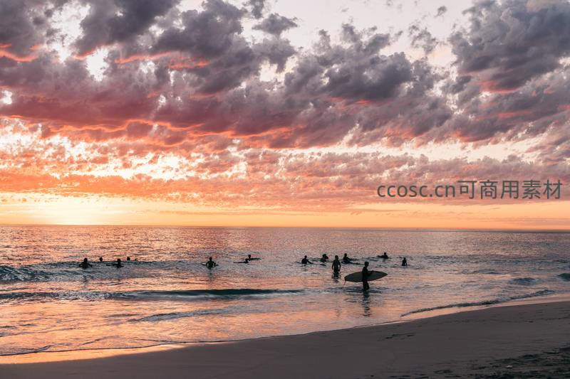 夕阳西下,绚丽的云霞倒映在海面,一群冲浪者带着冲浪板在浅滩中等待着下一个浪潮的到来。