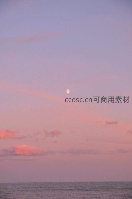一轮明月悬于粉紫色的暮色天幕,平静的海面倒映着柔和的光辉,营造出静谧安详的夜晚氛围。