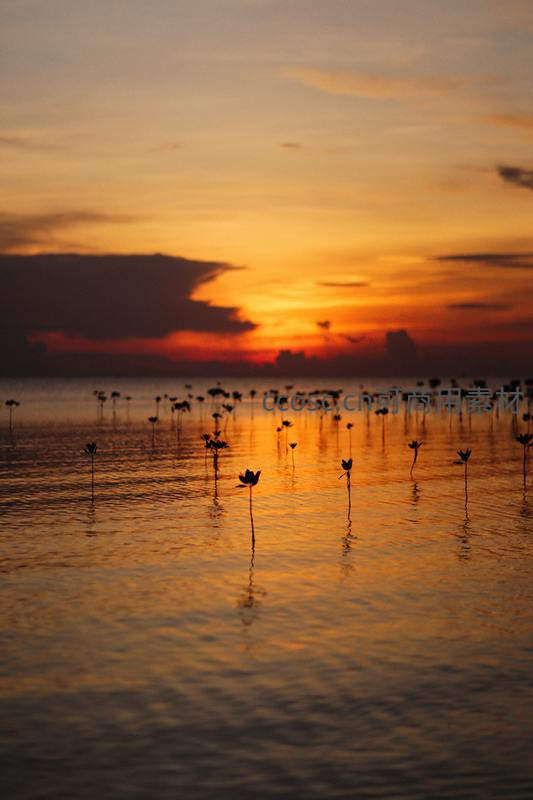 夕阳西下,金色光芒洒满湖面,水中莲花静静伫立,倒影摇曳,构成一幅宁静致远的画卷。