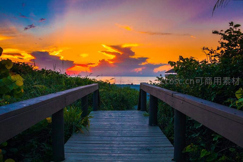 一条木质栈道穿过茂密的绿植,直通被绚烂晚霞笼罩的海边,天空中橙红与紫蓝交织,仿佛引领人们走向一个梦幻般的宁静世界。