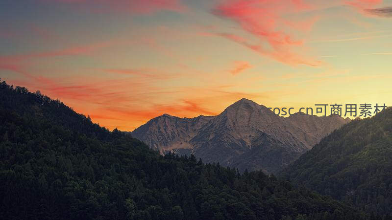 夕阳西下,金色的光芒洒满连绵起伏的山峦,山脚下茂密的森林在暮色中显得深邃,天空被染成一片温暖的橘红色。