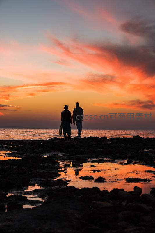 两位旅人并肩站在崎岖的礁石海岸,凝望天边如火焰般燃烧的晚霞,脚下的水洼倒映着天空的绚烂色彩。