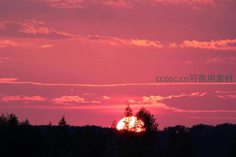 一轮巨大的橙红色太阳正缓缓沉入远方的森林树冠之后,天空被染成梦幻的粉红色,云层如丝带般横贯天际。