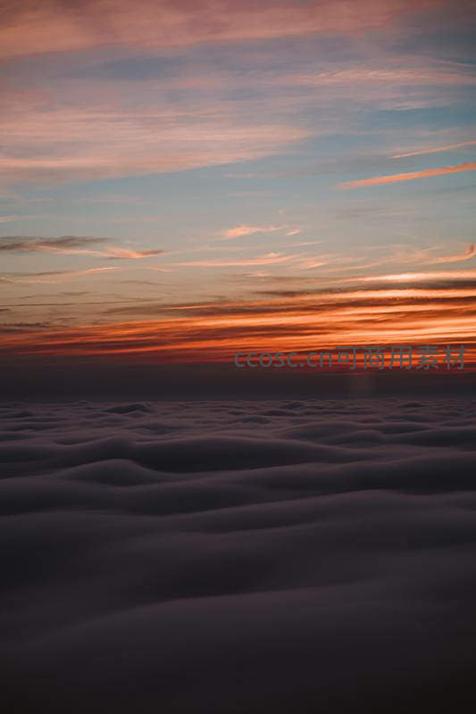 从万米高空俯瞰,脚下是无垠的云海,头顶的天空被夕阳染成绚烂的橙红与淡紫,仿佛置身于一个宁静而壮阔的仙境。