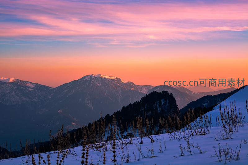 晨曦初现,粉紫色的天空笼罩着连绵的雪山,前景的枯草在雪地上投下剪影,构成一幅宁静壮阔的高山画卷。
