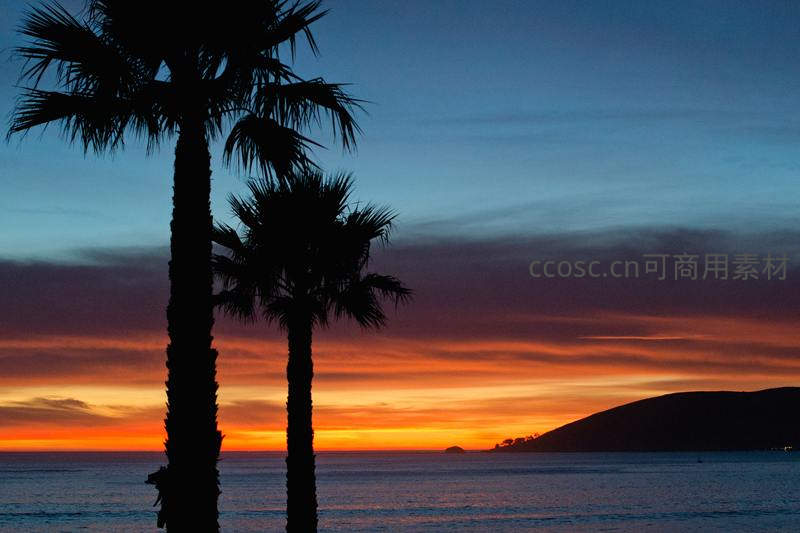 两棵高大的棕榈树在绚烂的橙红色日落天空下形成完美剪影,平静的海面与远处山峦共同构成一幅宁静而壮丽的热带黄昏画卷。