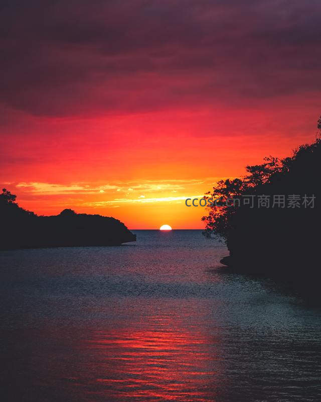 一轮血红的太阳沉入峡湾尽头,将整个天空染成炽热的红色,水面如镜般倒映着这壮丽景象,两岸的黑色山峦剪影更添一份神秘与宁静。