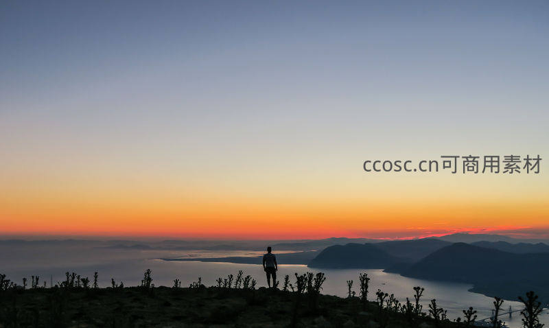 一人独自伫立在山顶,背对镜头凝望远方,脚下是浩渺的云海与湖泊,天边初升的朝阳将天空染成温暖的橙黄色,画面充满宁静与哲思。