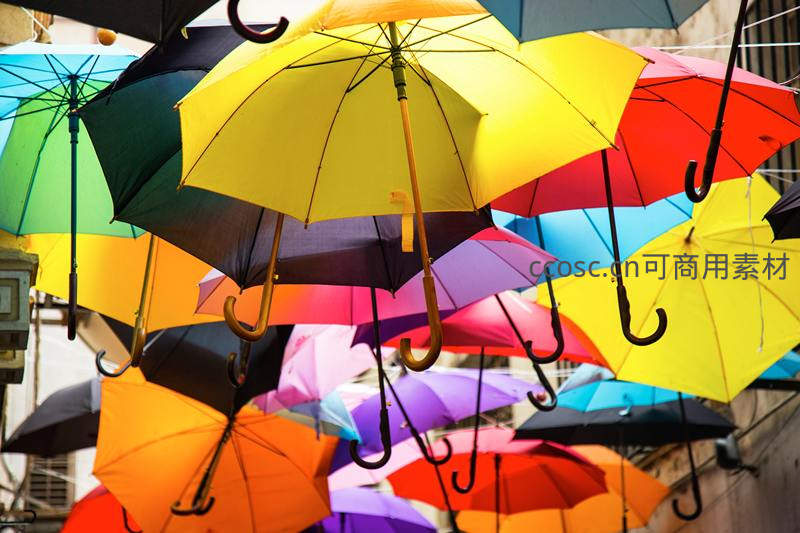 五彩缤纷的雨伞悬挂在街道上空,形成一道绚丽的空中长廊,为阴雨天气增添活力与艺术感,吸引路人驻足欣赏。