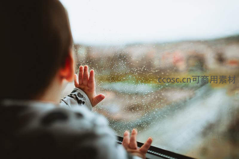 一个孩子背对镜头,双手轻贴布满雨滴的窗玻璃,凝望窗外朦胧的城市景象,流露出纯真与对外界的好奇与向往。
