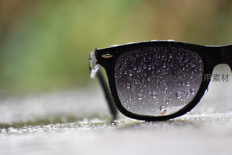 一副黑色墨镜置于湿润的表面,镜片上凝结着细密的雨珠,背景是柔和的绿色虚化,凸显了雨后的清新与质感。