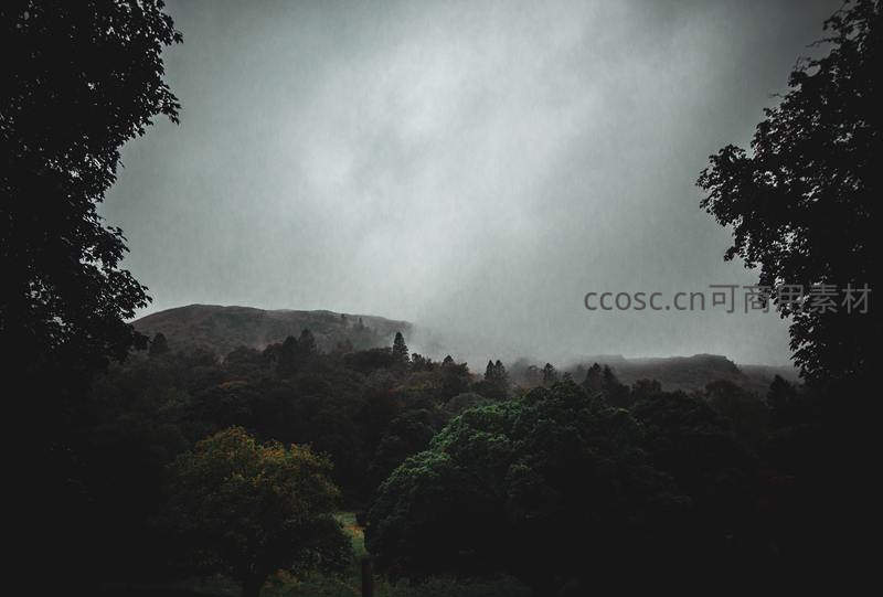 阴雨笼罩山林,云雾缭绕如画