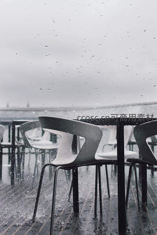 雨水拍打在户外咖啡座的桌椅上,空无一人的座位在朦胧雨幕中显得格外安静,营造出一种孤独而诗意的氛围。