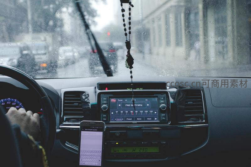 从驾驶员视角看去,雨滴布满前挡风玻璃,中控屏幕显示导航信息,手机支架固定着手机,展现现代都市通勤场景。