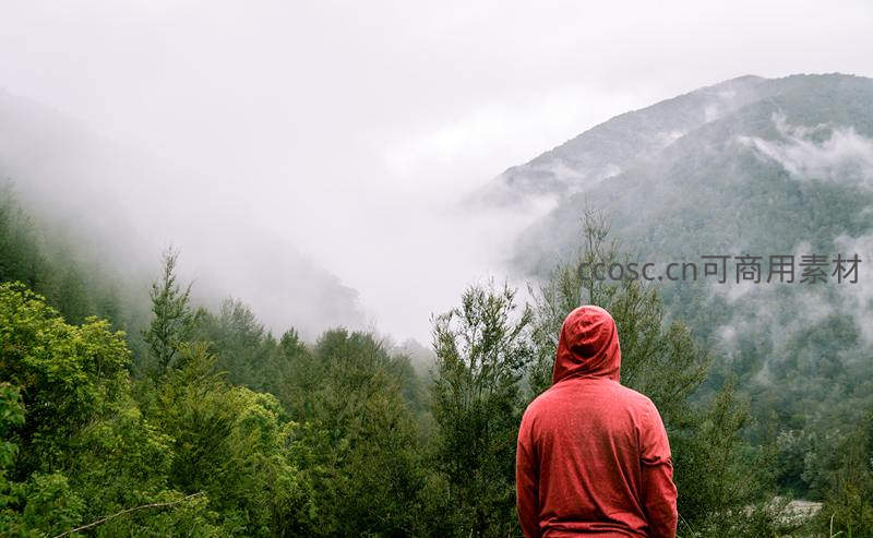 一位穿着红色连帽衫的旅人背对镜头,伫立在山顶,凝视着脚下被浓雾笼罩、绿意盎然的连绵山脉。