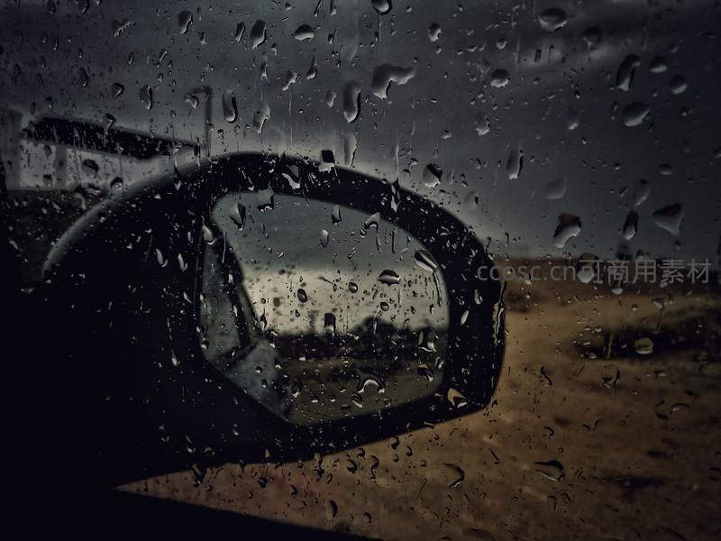 雨中车镜倒映荒野阴沉天空景象