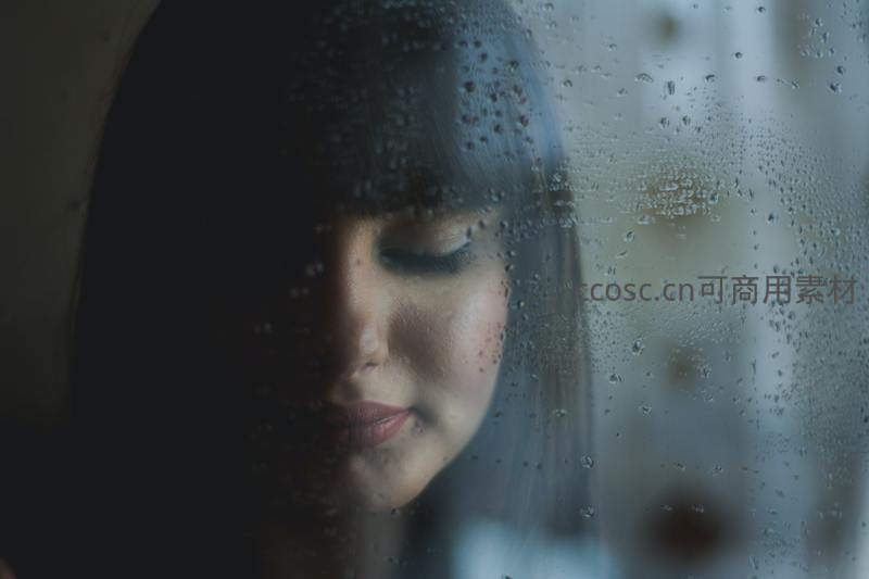 透过布满水珠的玻璃,一位女子闭目沉思,柔和光线勾勒出宁静而略带忧郁的侧脸轮廓。